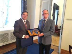 Eesti Lipu Seltsi kingitus Tartu Ülikoolile-Rahvusülikool 100 puhul. Eesti Lipu Seltsi esimees Jüri Trei annab rektor Toomas Asserile üle piduliku sinimustvalge kandelipu.
